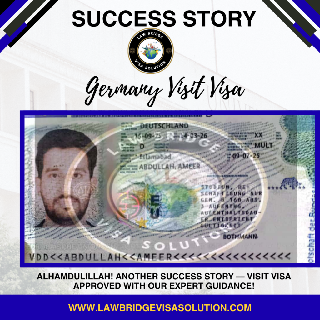 Alhamdulillah! We are pleased to share another successful milestone achieved by Law Bridge Visa Solution with the approval of a Germany Visit Visa for our valued client, Mr. Ameer Abdullah.