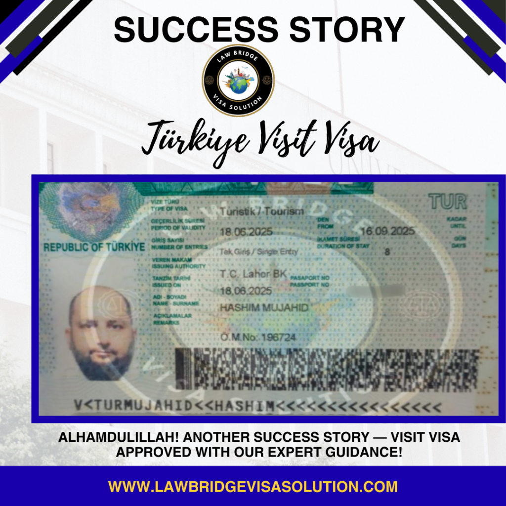 Law Bridge Visa Solution is pleased to share another successful outcome with the approval of a Turkey Visit (Tourism) Visa for our client, Mr. Hashim Mujahid.
