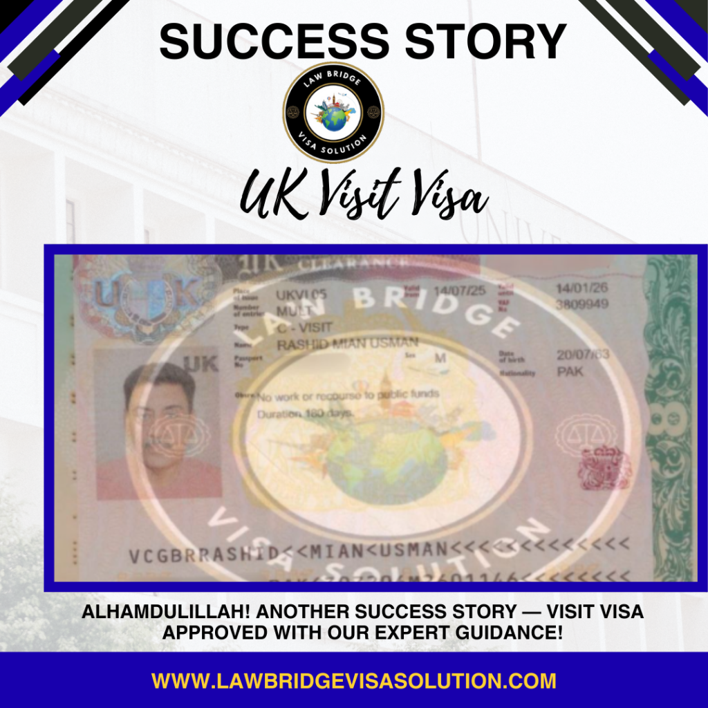 Alhamdulillah! We are delighted to share another successful achievement by Law Bridge Visa Solution with the approval of a UK Visit Visa for our valued client, Mr. Rashid Mian Usman.