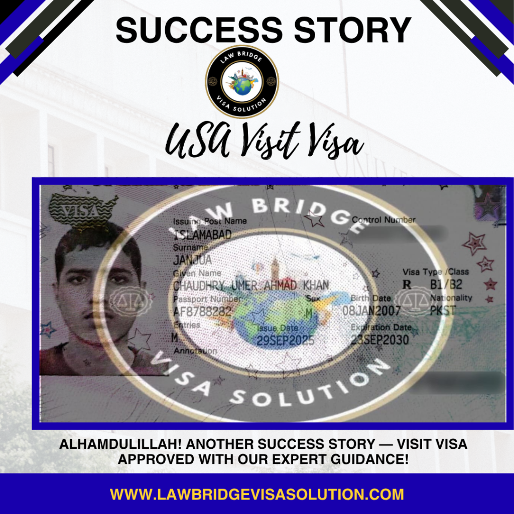 Alhamdulillah, his USA Visit Visa has been approved with the expert guidance of Law Bridge Visa Solution. Umerβs journey proves that with the right preparation, guidance, and documentation, even first-time applicants can achieve their dream effortlessly.