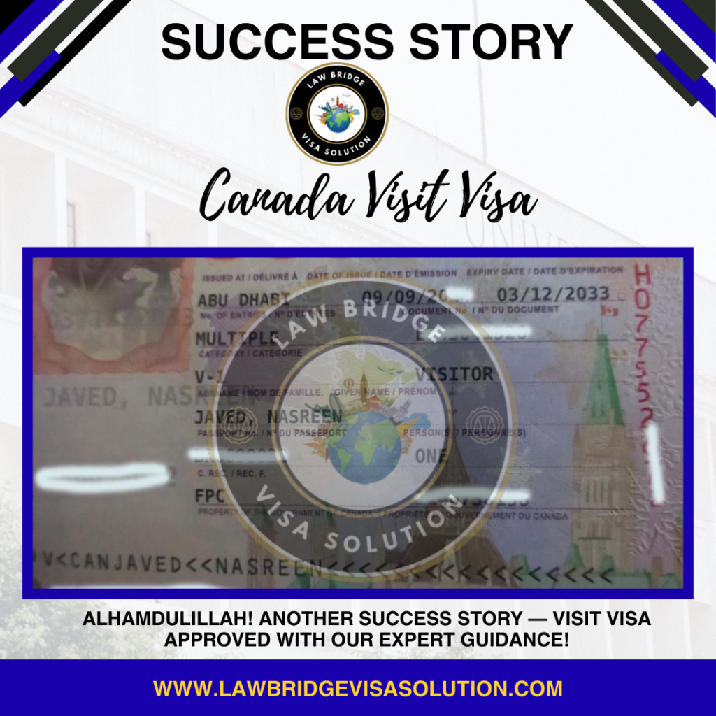 At Law Bridge Visa Solution, based in Lahore, we are dedicated to helping our clients achieve their international travel goals with confidence. We are proud to announce another significant achievement: a Canada Multiple Entry Visit Visa (V-1 Category) has been successfully approved for our client, Nasreen Javed.